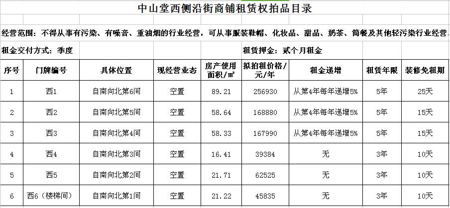 關(guān)注微信公眾號(hào)我公司受委托,定于2017年6月7日10時(shí)在徐州中山南路55號(hào)7樓拍賣徐州市中山堂一層西側(cè)沿街門面房租賃權(quán),共計(jì)6間,面積分別為16.41㎡、21.22㎡、21.71㎡、58.33㎡、58.64㎡、89.21㎡。租賃年限為3-5年。