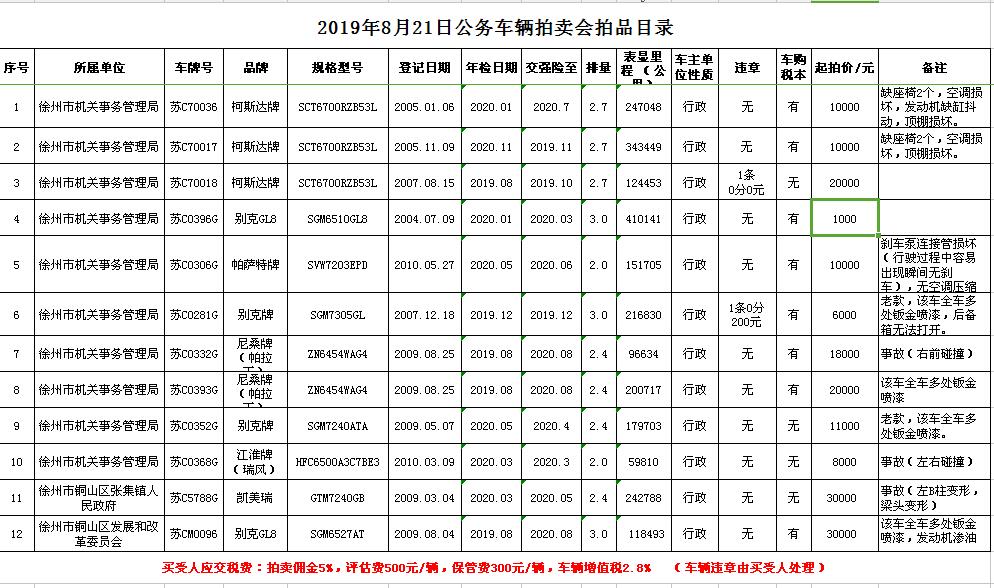 關(guān)注微信公眾號受委托,我公司定于2019年8月21日13:00時在徐州市銀地二手車交易市場四樓東南拍賣大廳通過現(xiàn)場和汽車街網(wǎng)絡(luò)拍賣平臺同步進(jìn)行的方式公開拍賣以下公務(wù)車輛: