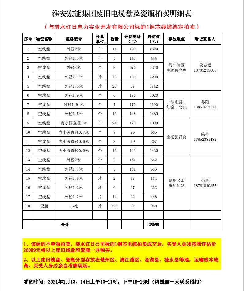 關(guān)注微信公眾號受委托,我公司將通過中拍平臺以網(wǎng)絡(luò)競價的方式公開拍賣以下單位廢舊電力物資。主要包含:廢舊電纜盤、銅芯電纜、鋁芯電纜、鋼管塔、鐵附件、開關(guān)柜、變壓器、雜項(xiàng)物資等。