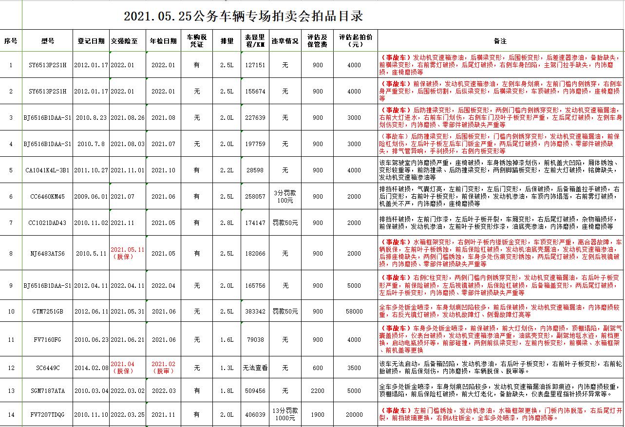受委托,我公司定于2021年5月25日10時在中拍平臺通過網(wǎng)絡(luò)競拍方式公開拍賣以下公務(wù)車輛: