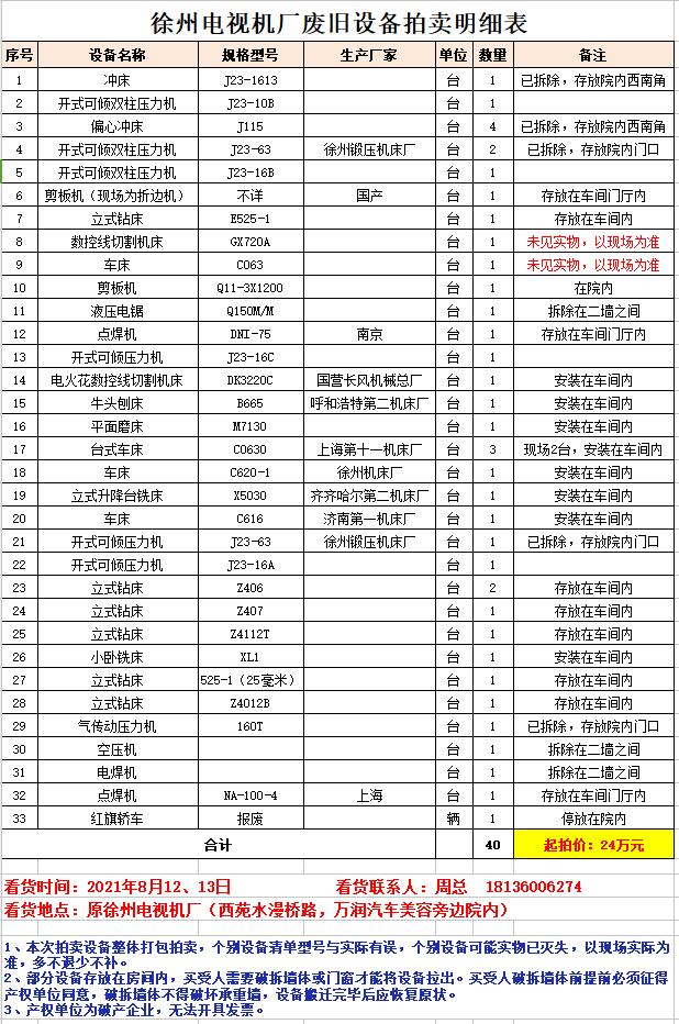 1、徐州電視機(jī)廠廢舊設(shè)備一批。包含:沖床、壓力機(jī)、折邊機(jī)、鉆床、機(jī)床、車床、刨床、磨床、銑床等、空壓機(jī)、電焊機(jī)等。(競(jìng)買人須為具有再生資源回收資質(zhì)的企業(yè)法人),保證金5萬(wàn)元。